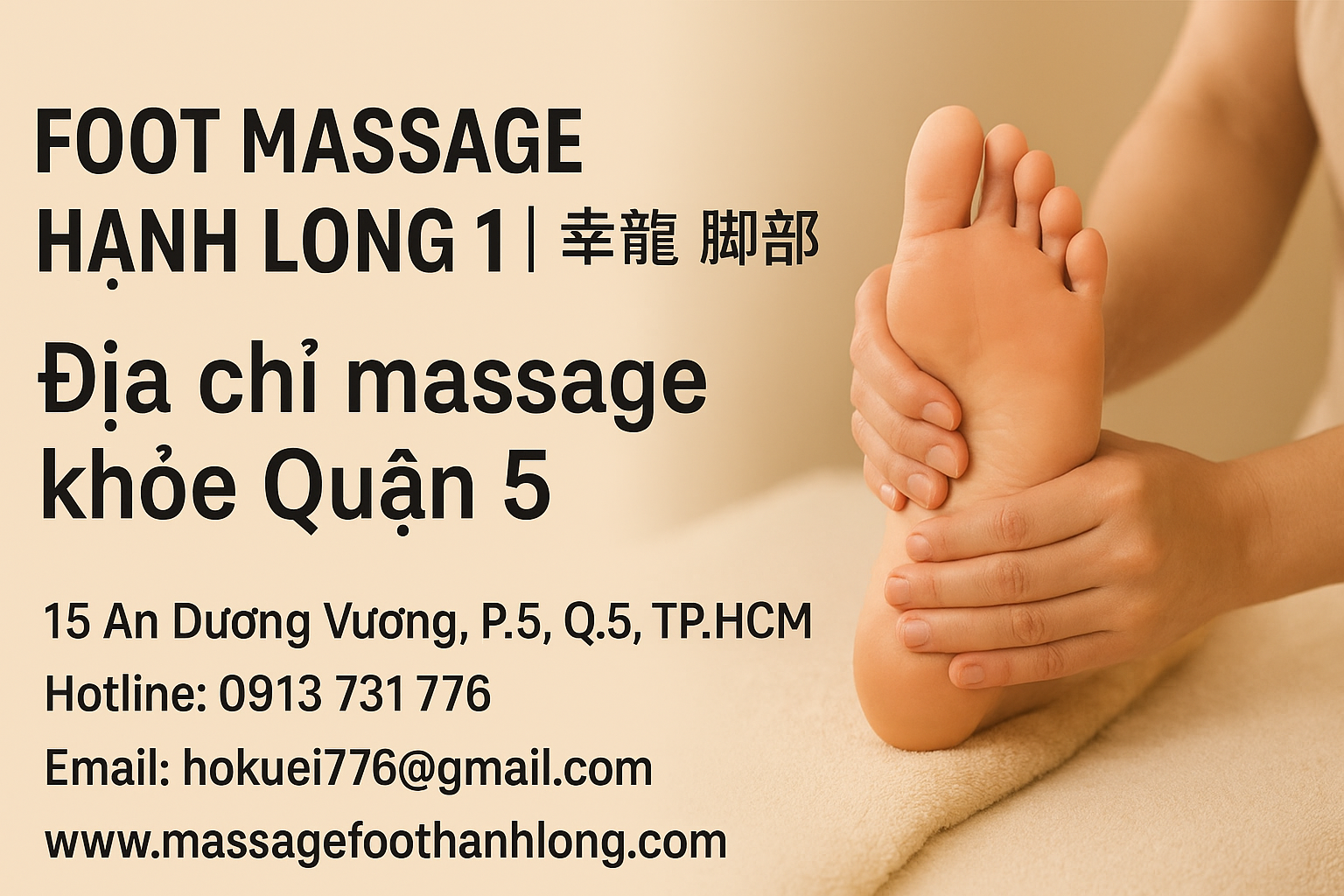 Bạn đang tìm một nơi massage khỏe Quận 5 uy tín để thư giãn và chăm sóc sức khỏe? FOOT MASSAGE HẠNH LONG 1 | 幸龍 脚部按摩 chính là điểm đến lý tưởng dành cho bạn. Với đội ngũ kỹ thuật viên chuyên nghiệp, am hiểu huyệt đạo, Hạnh Long 1 mang đến liệu trình massage chân và body giúp giảm đau nhức, lưu thông khí huyết và tái tạo năng lượng hiệu quả.