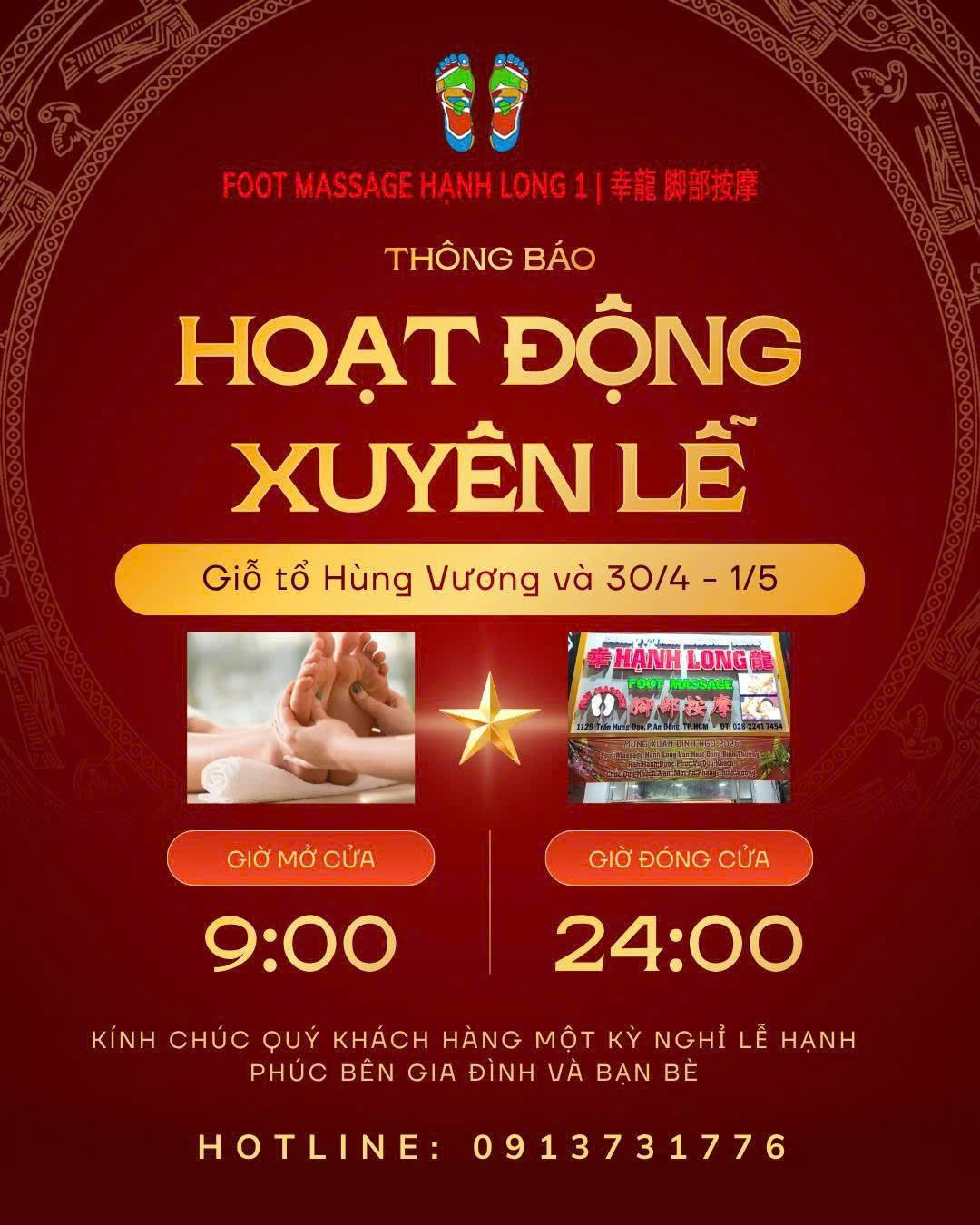 Nhằm phục vụ tốt nhất nhu cầu thư giãn, chăm sóc sức khỏe của Quý khách trong dịp lễ, Foot Massage Hạnh Long 1 xin trân trọng thông báo: